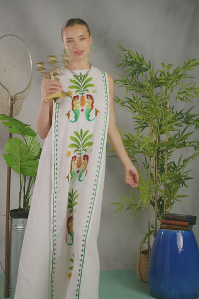 This printed dress blends elegance and comfort. Its sleeveless design, round neckline, and vertical cut visually elongate the silhouette. The lightweight and breathable linen makes it perfect for warm weather. It features refined details and finishes, including a discreet back opening and a button-and-loop closure for added comfort.