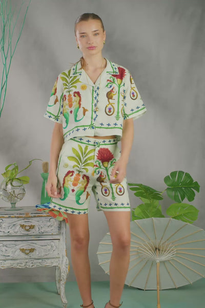 The silvan green shorts highlight the mythological inspiration of the Dreamland by soloio collection. Figures of centaurs and ornamental motifs emerge in luminous turquoise tones, creating a composition that is both artistic and modern. This design turns the shorts into a bold expression of creativity and individuality, crafted for women who dress with elegance and imagination.