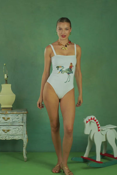 The teodor print, part of the Dreamland collection, features Teodor the tamer, a monkey riding a giant two-headed heron. This fantastic scene celebrates imagination and the surreal, turning the swimsuit into a unique piece that connects with magic and the extraordinary.